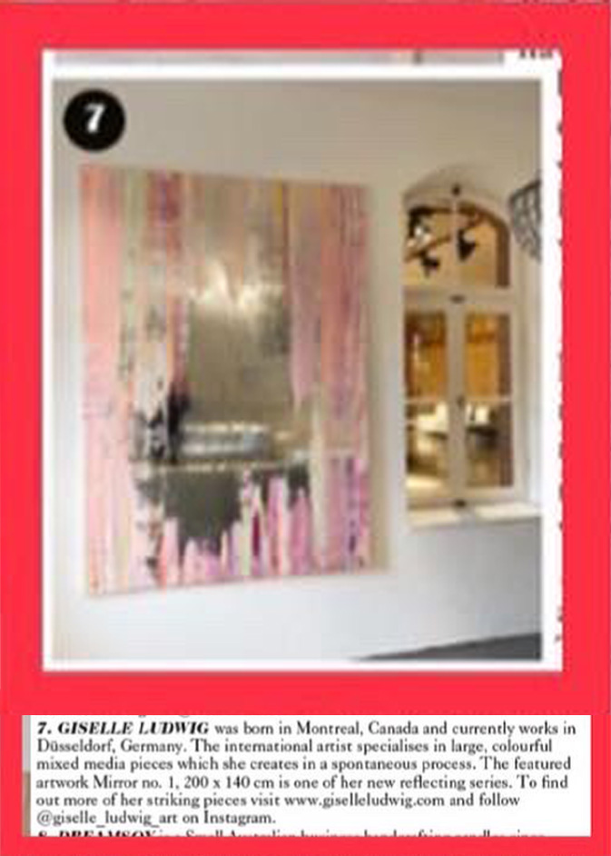Giselle Ludwig is an international abstract artist and art historian (MA), born in Montreal, Canada and living and working in Düsseldorf, Germany. Her mostly large acrylic paintings are created in a spontaneous and unintentional process. She therefore uses different mixed media techniques, materials and tools. With various layers, structures and forms she stimulates the viewers imagination and always tries to create a positive association and atmosphere.